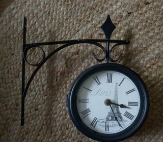 horloge ronde thème Paris au cadran avec des chiffres romains montée sur un support en métal noir Diamètre de 15 cm - Support en métal noir - double face fonctionne avec 2 piles
