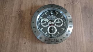 Horloge murale Rolex Daytona inox fond noir neuve 34cm. Corps tout inox diamètre: 34 cm Poids : 1,65kg sans l'emballage Lunette : graduation thermocollée pas d'adhésif. Fond