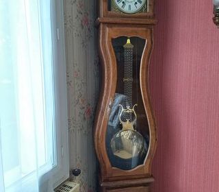 Horloge comtoise en bois avec cadran à chiffres romains, décorations dorées et partie vitrée sur la façade laissant apparaître le balancier. L'objet est posé dans un angle de la pi