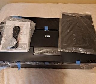 Imprimante Epson noire avec accessoires, comprenant un câble d'alimentation, un guide d'installation et un plateau, le tout emballé dans des sachets plastiques.Stylus Photo 1500W.