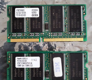 Je vends ce lot de 2 barrettes mémoire SO-DIMM de 128 Mo. - Type d'accessoire : Barrettes mémoire SO-DIMM - Capacité : 128 Mo - Quantité : 2 Très bon état barette 1 = HYNIX PC