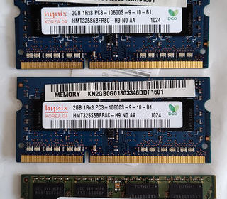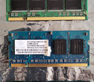 Je vends ce lot de 3 barrettes mémoire SO-DIMM DDR1 DDR2 512Mo barette 1&2 DDR2 = NANYA PC2-4200S-444-12-A2 NT512T64UH8A1FN-37B barette 3 DDR1 = Mistubishi PC2100S-2533-0-Z1 M