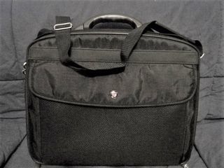 Sacoche pour transport de PC Toile imperméable Couleur : Noire Intérieur doublé "soie" "fermeture éclair " 4 poches intérieur + 2 sur côté "ferm. velcro" 1 poche coté avec s