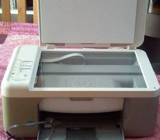 Imprimante HP deskjet F2280 all in one avec câbles alimentation et pc faisant scanner descriptif sur photo les cartouches vides sont en places pour éviter que les buses ne se bou