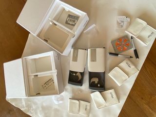 deux appareils auditifs aides auditives prothèses auditives marque OTICON AGIL PRO avec boites, pochettes, dispostif à coller sur téléphone fixe pour mieux entendre, une plaquette