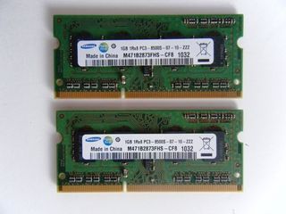 Lot de 2 mémoires RAM 1 GB PC3 8500S Piéces de démontage d'un APPLE MACBOOK MC516 A1342. Bon état Marque : SAMSUNG Caractéristiques : 1GB PC3 8500S SO-DIMM DDR3 204 broches 10