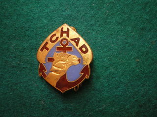 Insigne colonial - Régiment de Marche du TCHAD. Description : En métal et émail de 30 mm de hauteur. Il présente une tête de chameau dorée sur une ancre de marine avec l'inscriptio