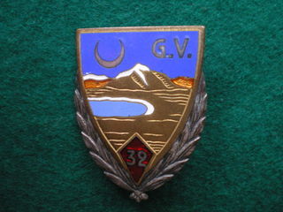 Insigne de Santé - 32° Groupe Vétérinaire. Description : Dans un écu en métal et émail, un paysage de montagne et de lac avec les lettres G.V dans le haut et un écusson rouge marqu