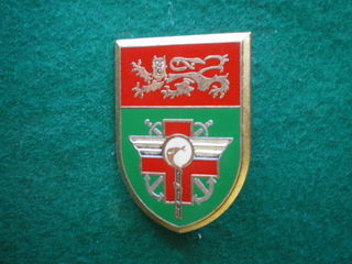 Insigne de Santé - Etablissement Central du Matériel et Mobilisation. Description : Dans un écu en métal et émail vert et rouge, un lion doré dans un bandeau rouge et la croix roug