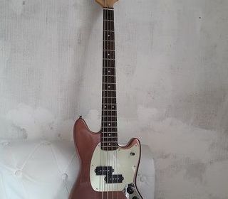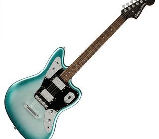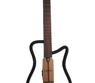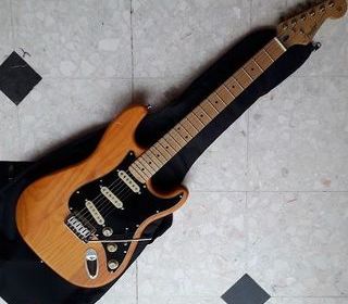Guitare électrique couleur verte avec caisse de résonance et étui de transport noir. Comprend deux micros, un chevalet spécifique, des boutons de réglage et un manche en bois avec