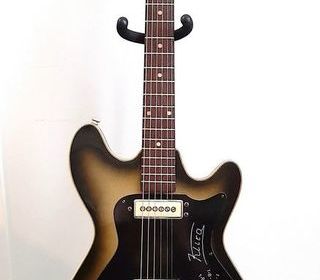 Guitare électrique couleur verte avec caisse de résonance et étui de transport noir. Comprend deux micros, un chevalet spécifique, des boutons de réglage et un manche en bois avec