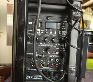 sono ibiza port8vhf-bt avec pied porte sono et transport a roulette avec deux micro hf et un micro wireless avec un transmetteur recepteur une guitare amplifier+ pied avec un jt