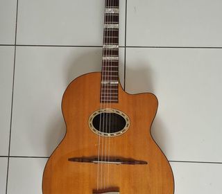 Guitare jazz cordes métal parfait état, achetée neuve vers la fin des années 60 et très peu utilisée. Première main. Pan coupé, table massive, manche avec nacre. Fabricant : Henr