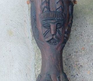 peau percée en bois hauteur 60 cm, diamètre 25 cm visage sculptés Remise en main propre possible sur Paris A LIRE : 95250 = Beauchamp expédition possible, port à votre cha