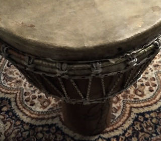 Superbe djembé, comme neuf, utilisé uniquement comme objet de décoration. ? Bois sculpté à la main avec motifs africains ? Hauteur : 61 cm ? Diamètre : 33 cm ? Poids : env. 8,4 k