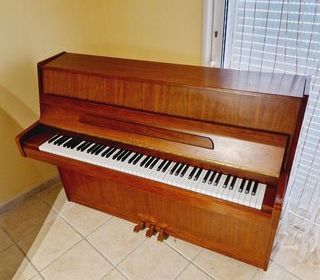 Piano droit noir acheté d'occasion durant la première guerre. Restauration faite dans les années 1980. Touches en ivoire, chandeliers et poignées en bronze