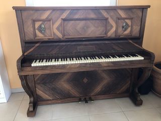 Piano droit à pétales en bois de la marque Taylor. Le tissu à l'arrière est un peu déchiré par endroits (voir photo) (mais non visible si le piano est placé devant un mur). Il