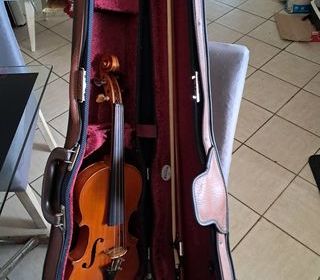 Violon 3/4 très bon état ,etuit en cuir marron. Archet très bon état . Guitare très bon état complète etuit en tissus noir avec pied porté guitare.