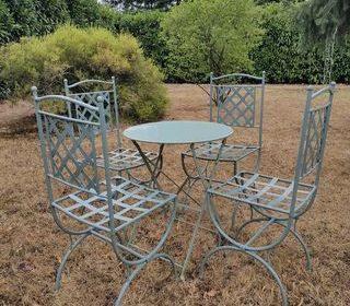 Vends salon de jardin vert , table : hauteur 71 cm , diamètre 60 cm , 4 chaises : hauteur totale 97 cm , hauteur d'assise 47 cm , profondeur d'assise 40 cm , largeur d'assise 40 cm