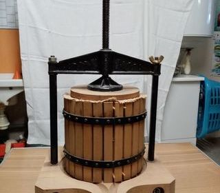 Pressoir pro pour fruits très peu servi avec tableau réceptacle en hêtre ep 50mm , étrier en fonte d'acier , vis en acier , parfait état . Table 340 x 200 , Ht cuve 210 , diam cuv