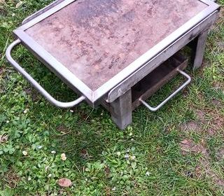 Vend plancha pour feu de bois fabrication artisanale 52cm x 35 cm ep 3 cm pierre naturelle provenant d'une carrière italienne armatures inox avec poignées bac à feu et structure d