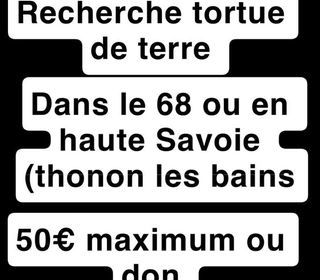 je recherche quelqu'un qui donne ou vend une tortue terrestre 50€ négociable dans le 68 (wittenheim,kingersheim, Mulhouse, ensisheim etc) et en haute Savoie (thonon les bains, evia