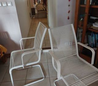 2 fauteuils plastique, et support en métal très bonne assise ,stables et confortables .couleur blanc . Ideal pour extérieur mais je les utilisais à l'intérieur.