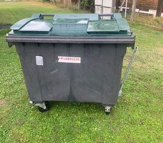 Conteneur marque Labruche fabriqué en France, 4 roues, préhension latérale, longueur : 125 cm, largeur : 77 cm, hauteur : 117 cm, ouverture sur le dessus.