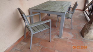 Table de jardin PVC verte avec rallonge. 4 pieds et barre traversal. 1,60 m long. 0,50 m de larg. Rallonge : 0,50 m A prendre sur place , pas d envoie.