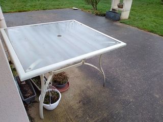 Table d'extérieur carré Pieds et contour en alu vert clair Plateau en verre Taille 115*115cm A emporter Visible à St Loup 39120