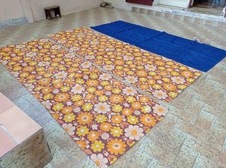 2 Matelas pneumatiques de couleur fleurs jaunes revers uni rouge 2m01 X 69 cm largeur 1 matelas pneumatique de couleur bleu électrique revers uni rouge 1m93 X 76 cm lar