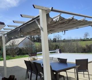 Bain de Soleil Suspendu et Pare-Soleil Passiflore . Structure en Acier avec 4 Pieds . Matière de l'Assise Toile Grise Matelas Toile Polyester Beige . Pare-Soleil forme de Feui