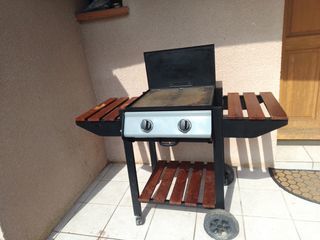 Plancha deux brûleurs en fonte ainsi que la plaque de cuisson montée sur roulette : plaque réversible 1 plate 2 à griller dimension 48x48 vendu sans tuyau nie bouteille nie détende