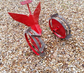 Kit de buttage pour motobineuse avec une paire de roues en fer , diamètre intérieur tube 3 cm et 30cm diamètre extérieur ainsi qu'un butteur réglage en largeur (barre de maintien