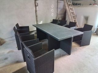Salon 8places avec 8 coussins blanc. En stock depuis 2 ans dans mon dépôt, à prit un peu la poussière.