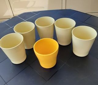 Lot 6 Cache-pots Fleurs : - 5 Jaunes clairs - Hauteur : 15.5 cm - Diamètre haut : 13.5 cm - Diamètre bas : 10 cm - Made in Germany - 1 Jaune plus foncé: - Ha