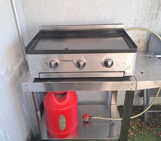 plancha professionnelle à gaz 3 feux plaque en fonte grand tiroir pour déglaçage vendu avec détendeur et bouteille de gaz. très bon état .prix définitif.
