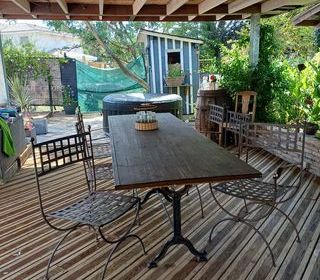 Ensemble table de jardin comprenant 1 grande table empiètement fonte style rétro avec plateau bois 2500 x 80 cm Hauteur 74 cm, accompagnée de 2 chaises et 4 fauteuils en métal coul