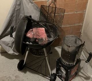 Barbecue à charbon rond avec couvercle, grille de cuisson et ustensiles, accompagné d'une cheminée d?allumage posée sur une boîte.
