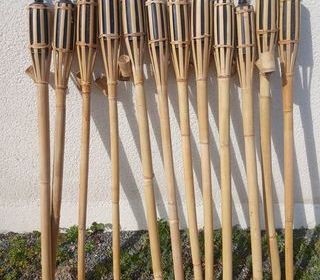 Torcheres en bambou avec éteignoir a remplir de produis anti moustiques ou autres pour une ambiance festive il y a 12 pieces la hauteur est de 1 m 30 le diamètre est de 4 cm l