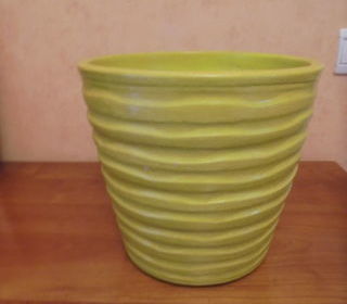 Pot pour fleurs, en céramique peinte, de couleur verte, motifs nervurés sur tout le pourtour, Dimensions : - hauteur 22 cm, - diamètre base 17 cm, - diamètre haut 25,5 cm.