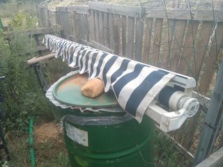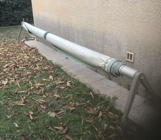 Courverture d'Hivernage de sécurité conforme norme P 90-308, avec pitons escamotables et sandows crochets, dim 4mlx8ml, avec portique alu sur pied et manivelle; bon état..