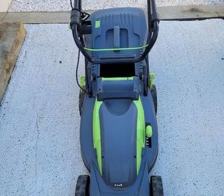 Tondeuse à gazon électrique, Green Cut, 1400W. Hauteur de coupe 20-40-60 mm. Bac rigide 30L. Guidon repliable pour un rangement aisé