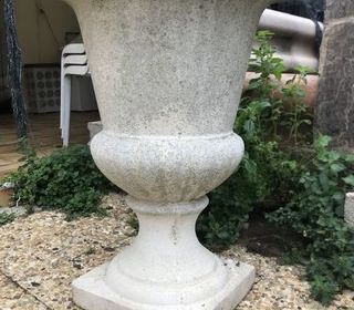 2 Grand vases style Médicis en pierre reconstituée Diamètre 51 Hauteur 66 Très bon état malgré le temps (Patiné avec le temps) Pas du tout abimés. a prendre sur place pas d'