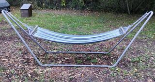 hamac avec son support peint en peinture antirouille grise grosse toile rayée vert et bleu en bon état bonnes fixations inox prix négociable