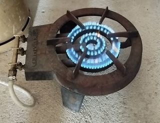 trépied à gaz en fonte 3 robinets laiton en parfait état de fonctionnement vendu avec bouteille gaz 13 kg