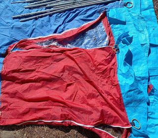 Toile de tente rouge et bleue pour protéger du matériel, du bois, ... Il y a une tente complète, mais il manque 1 barre alu, et la ferme