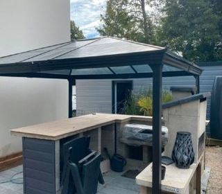 Vends tonnelle polycarbonate (2023) alu gris foncé avec rideaux (les rideaux sont neuf encore emballés). Dimension - 3,45 m x 2,8 m - hauteur 2,63 m Tout en polycarbonate