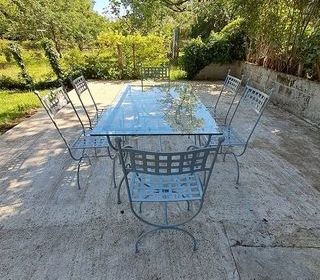 Superbe salon de jardin en très bon état comprenant 6 chaises en fer et une table dont le plateau en verre épais mesure 160 x 90 cm2 ; ce salon a été repeint l'an dernier.