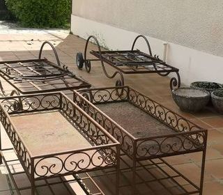 2 chaises longues +2 coussins +2 dessertes en fer forgé possibilité detaille